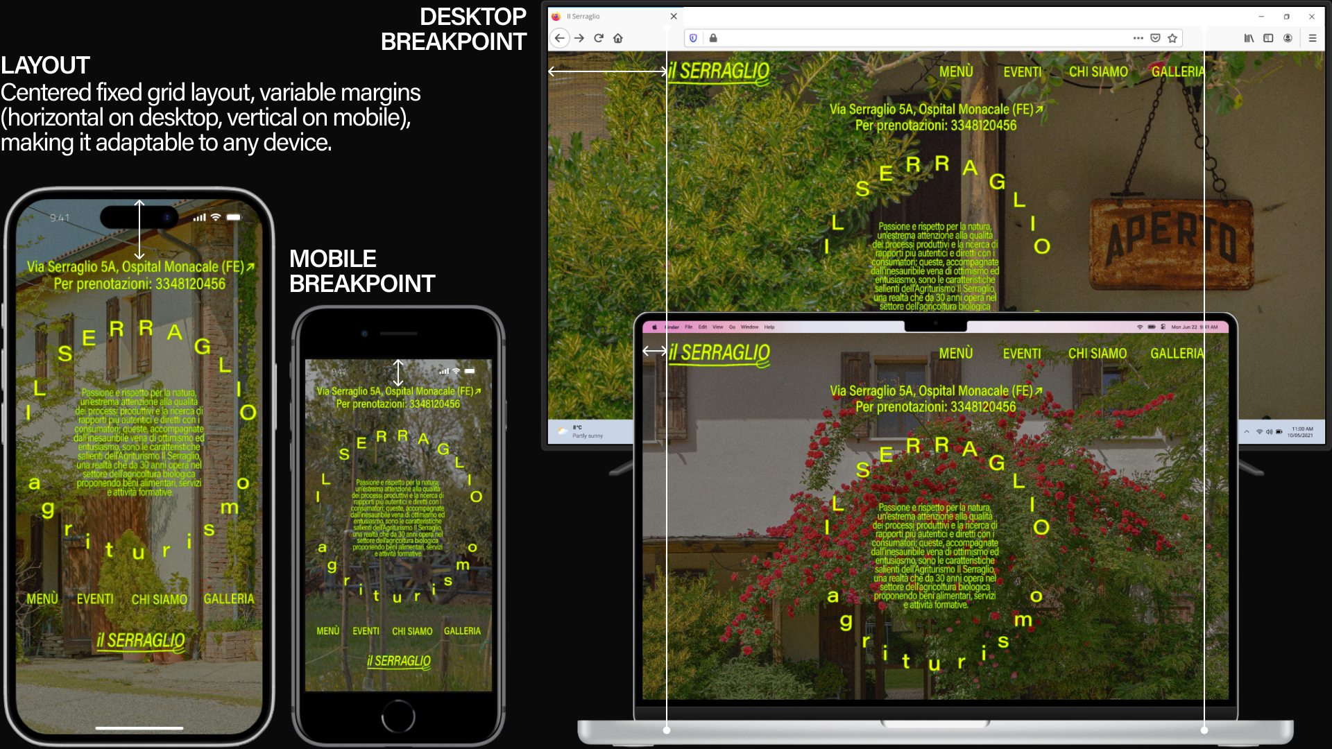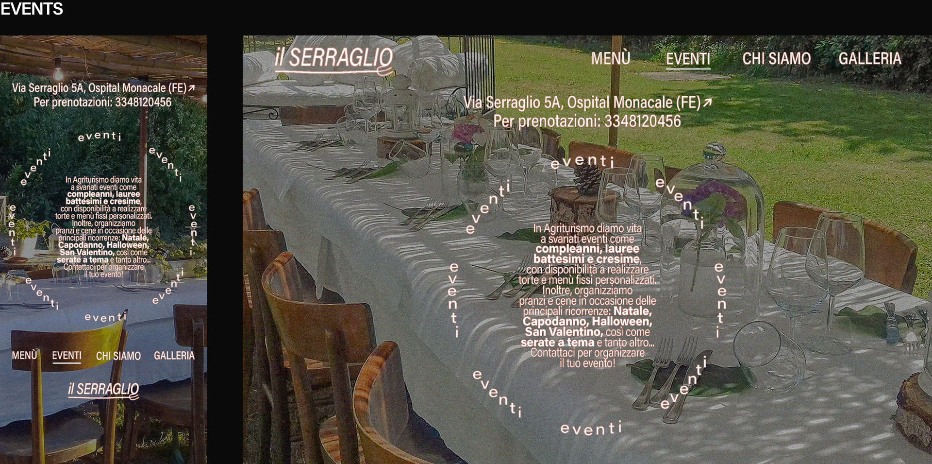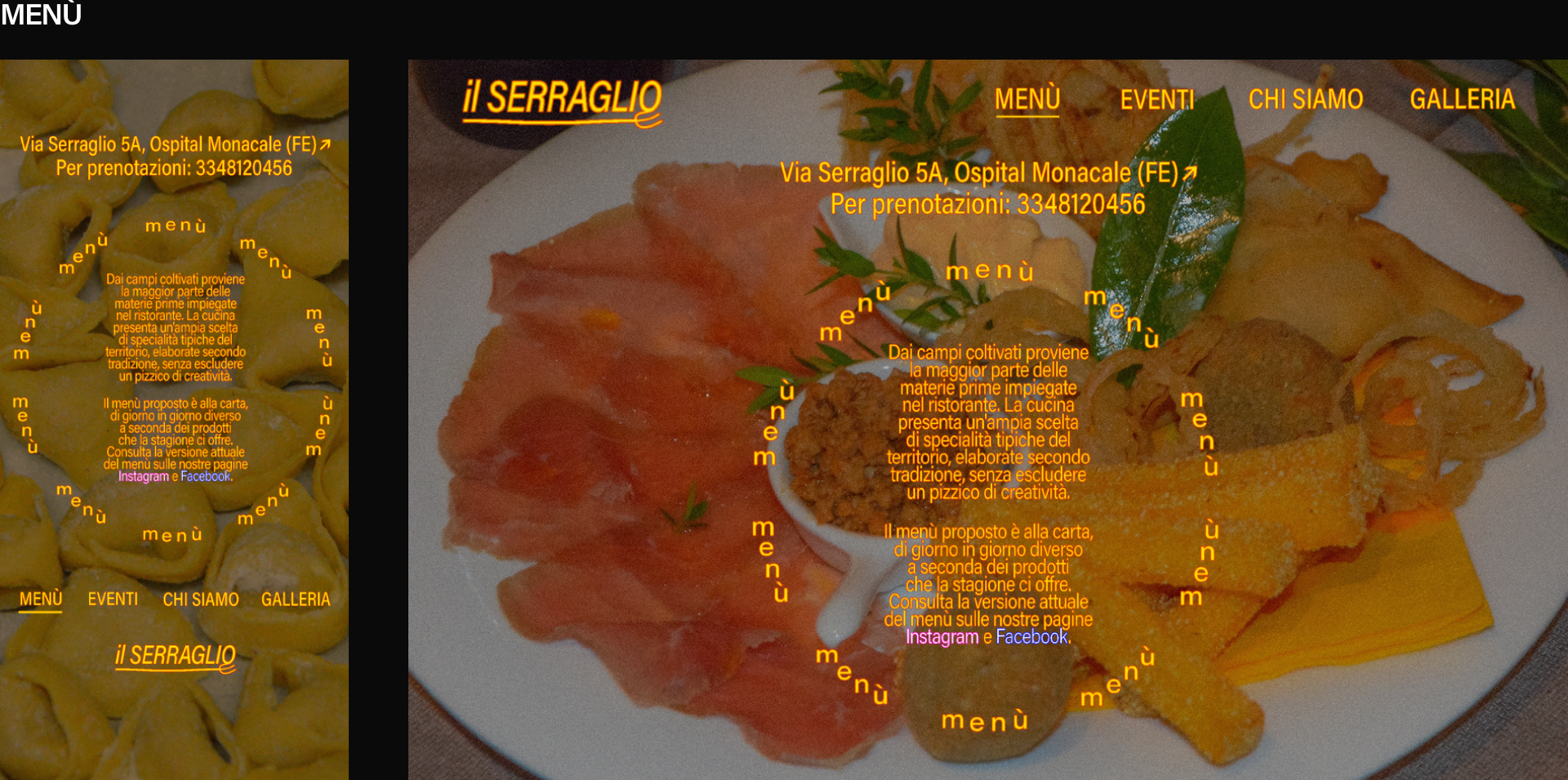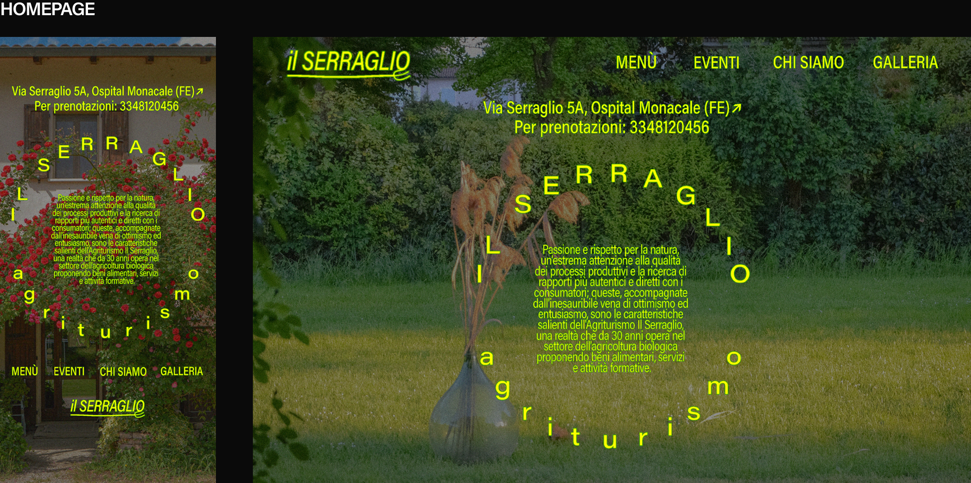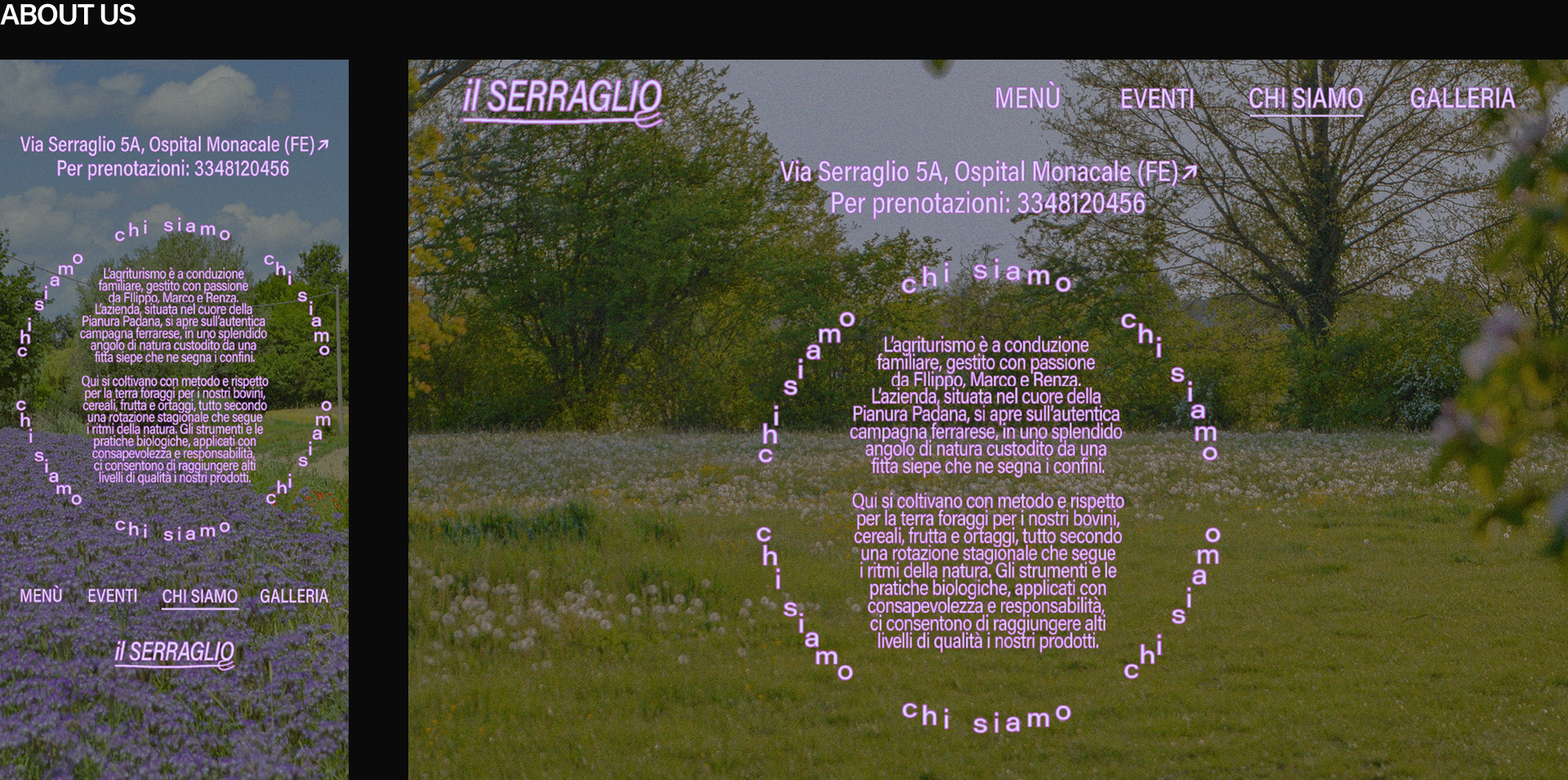 Website and brand design commissioned by Il Serraglio, a high-end restaurant that focuses on organic, home-grown ingredients and a menu deeply rooted in Emilia-Romagna's tradition. "Serraglio" is an italian word for enclosure, managerie, hence the circular, all enclosing typographic/visual element in each section. On the background, parts of my collection of photographs taken on the farmhouse. The website (and brand)'s minimal design features only the most necessary information for the client, at the same time allowing space for the pictures to do the talking.